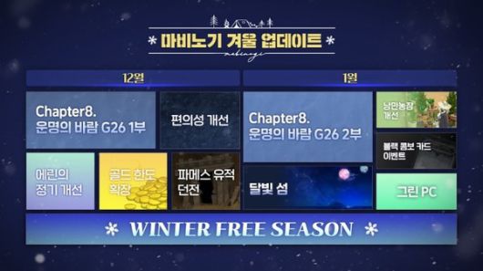 더 빠른 성장을 지원하는 겨울 프리시즌 일정과 사전등록 이벤트도 발표해 생중계 시청자들의 뜨거운 호응을 받았다. 마비노기는 12월 12일까지 겨울 1차 업데이트 G26 운명의 바람 사전등록 이벤트를 실시한다.