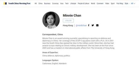지난달 30일 일본 교도통신은 SCMP의 군사전문기자인 미니 찬이 지난 10월 29∼31일 베이징에서 개최된 다자안보회의 행사인 ‘샹산포럼’을 취재하러 갔다가 연락이 끊겼다고 해당 기자의 측근들을 인용해 보도했다. 그의 마지막 기사는 10월 31일 자 샹산포럼 기사다. 앞서 찬 기자는 중국의 군부 단속과 리상푸 국방장관의 갑작스러운 해임 등에 관한 기사도 집필했다.