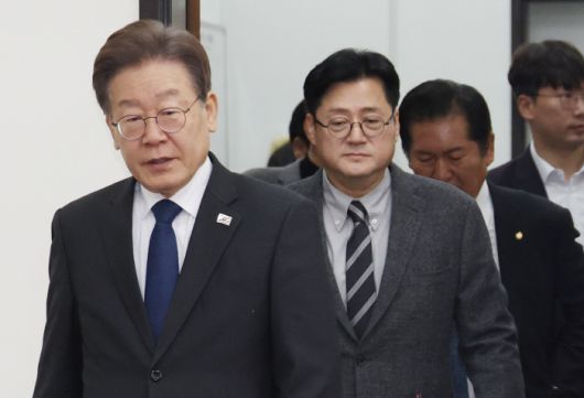 굳은 표정으로… 이재명 더불어민주당 대표(왼쪽)와 홍익표 원내대표(가운데)가 1일 국회에서 열린 최고위원회의에 입장하고 있다. 연합뉴스