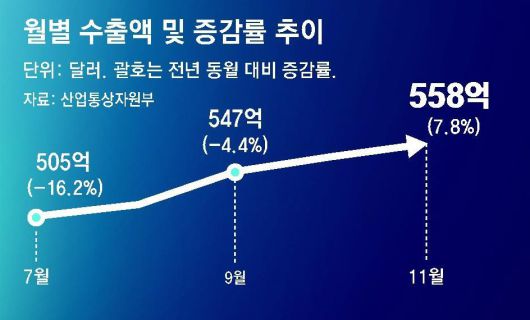 1일 산업통상자원부가 발표한 ‘11월 수출입 동향’에 따르면 지난달 수출은 558억 달러(약 72조8748억 원)로 1년 전보다 7.8% 늘었다. 10월 들어 수출이 13개월 만에 증가세로 돌아선 후 2개월째 늘어난 것이다.