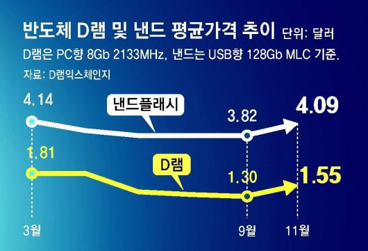 반도체 수출 증가는 가격 인상이 한몫했다. 시장조사업체 D램익스체인지에 따르면 11월 D램 범용제품(PC향 8Gb 2133MHz)의 평균 고정거래 가격(기업 간 거래가격)은 1.55달러로 전달보다 3.33% 올랐다. 올 9월 1.30달러로 바닥을 찍은 뒤 두 달 연속 가격이 오르고 있다. 또 다른 메모리 주요 제품인 낸드플래시 범용제품(메모리카드·USB향 128Gb MLC)의 평균 고정거래 가격도 4.09달러로 전달 대비 5.41% 올랐다. D램과 낸드플래시 가격은 2021년 7월 정점을 찍은 뒤 지속적으로 하락하다가 10월부터 반등하고 있다.
