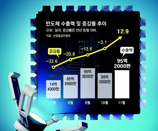 주력 수출 품목인 반도체 수출이 16개월 만에 플러스로 돌아섰다. 이에 따라 지난달 수출이 1년 전보다 7.8% 늘며 6개월 연속 무역흑자를 냈다. 글로벌 시장에서 정보기술(IT) 수요가 내년까지 이어지면서 수출 증가세가 한동안 이어질 것이라는 전망이 나온다.
