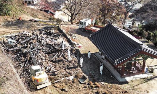 입적한 자리… 자승 스님 복원 당부 - 대한불교조계종 전 총무원장인 자승 스님이 숨진 채 발견된 경기 안성 칠장사 요사채(승려 숙소)를 지난달 30일 경찰과 국립과학수사연구원이 현장 감식하고 있다. 자승 스님은 요사채에서 지난달 29일 불에 타 숨진 채 발견됐다. 조계종이 공개한 자승 스님 유언장에는 이 건물을 2025년까지 복원해 달라는 내용이 담겼다. /연합뉴스