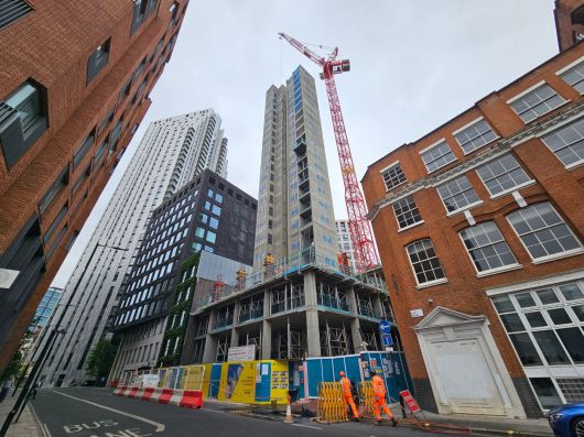 지난 6월 찾은 영국 런던 39이스트로드에 위치한 GS건설 자회사 엘리먼츠가 수주한 모듈러 호텔 공사 현장. 런던 중심부에 위치한 부지 특성 상 좁은 곳에 호텔 시설을 지어야 하고, 바로 옆에는 오피스 등 실제로 사용 중인 시설들이 있어 공사가 쉽지 않아 보였다. /백윤미 기자 |