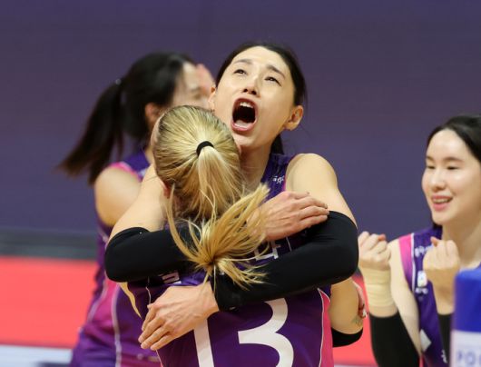 지난 1일 광주 서구 페퍼스타디움에서 열린 프로배구 V리그 여자부 페퍼저축은행과 흥국생명의 경기에서 흥국생명 김연경이 득점을 올린 옐레나를 얼싸안고 있다. 연합뉴스 |