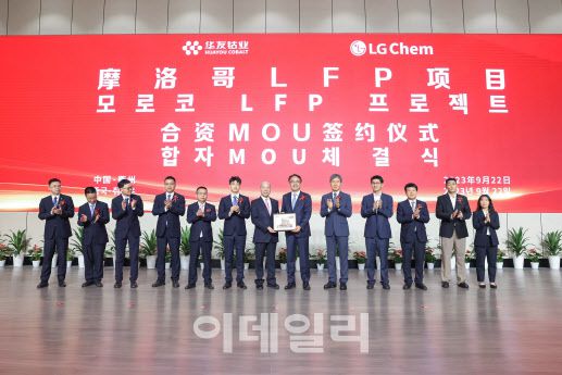 LG화학이 지난 9월22일 중국 화유그룹과 맺은 양극재 공급망에 대한 포괄적 업무협약(MOU)을 체결했다.(왼쪽 일곱번째부터) 천쉐화(Chen Xuehua) 화유코발트 동사장, 남철 LG화학 첨단소재사업본부장 부사장. (사진=LG화학) |