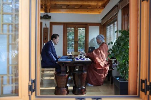 윤석열 대통령이 지난해 11월 8일 오전 서울 강남구 봉은사를 방문, 봉은사 회주 자승 스님과 환담하고 있다. 대통령실 제공/뉴스1