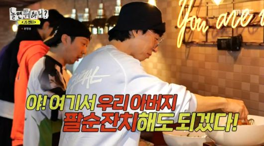 음식 맛에 대한 호평이 이어진 가운데, 유재석은 YG엔터테인먼트 소속인 주우재에게 “YG 구내식당도 맛있지 않나. 근데 긴장해야겠다. JYP가 신흥 강세다”라고 전했다. 주우재는 “나 너무 맛있게 먹으면 안 되나”라고 조심스러워했다.