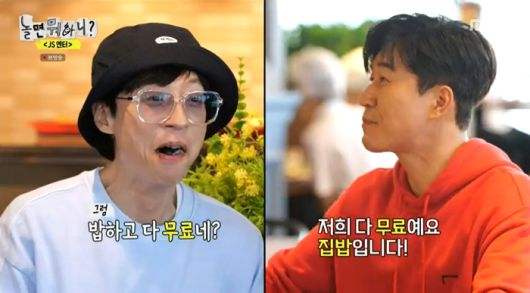 유재석은 “안테나에도 식당이 있다. 근처에 식당 많다. 자기가 가서 사 먹으면 된다”라고 밝혔다. ‘신바(신난바보)’ 엔터테인먼트에도 사무실이 있는지 묻자, 김종민은 “집에서 한다. 재택근무다”라고 답했다. 그는 “저희는 다 무료다. 집밥이다”라고 덧붙였다.