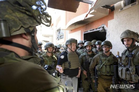 [가자지구=AP/뉴시스] 베냐민 네타냐후(가운데) 이스라엘 총리가 26일(현지시각) 가자지구를 방문해 이스라엘군이 발견한 하마스 지하 터널 중 한 곳을 둘러보면서 군인들과 얘기를 나누고 있다. 네타냐후 총리는 "우리는 끝까지, 승리할 때까지 계속할 것이며 그 어떤 것도 우리를 막지 못할 것"이라고 말했다. 2023.11.27. |