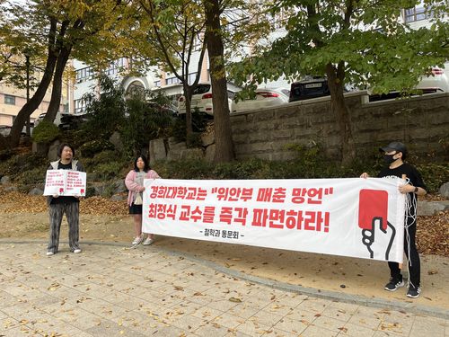 (서울=연합뉴스) 김정진 기자 = 경희대 철학과 동문회가 '위안부는 자발적 매춘'이라는 발언으로 논란을 빚은 최정식 교수에 대해 학교가 경징계를 제청한 사실이 알려지자 "실망스럽고 비겁한 결정"이라며 반발했다.