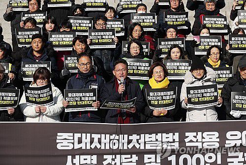 민주노총도 지난달 30일 법 적용 유예에 반대하는 노동자·시민 6만 명의 서명을 국회에 전달하며 법안 폐기를 촉구했다.