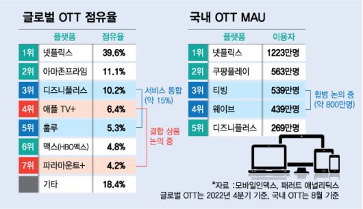 애플과 파라마운트가 자사 OTT(동영상스트리밍서비스) 결합상품 출시를 논의 중이다. 시장경쟁은 치열해지는데 가입자 이탈은 늘고 수익률마저 떨어지면서 새로운 생존방식을 찾아나선 것으로 풀이된다. 합병논의를 시작한 티빙, 웨이브와 유사한 행보다.