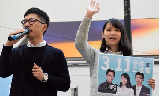 2018년 홍콩 입법회 보궐선거 당시 선거 운동 중인 아그네스 차우(오른쪽). 위키피디아