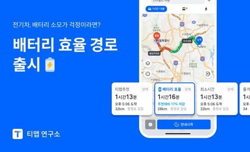 (서울=연합뉴스) 홍국기 기자 = 티맵모빌리티는 티맵에서 전기차 이용자를 위한 '배터리 효율 경로 안내' 서비스를 개시했다고 4일 밝혔다.