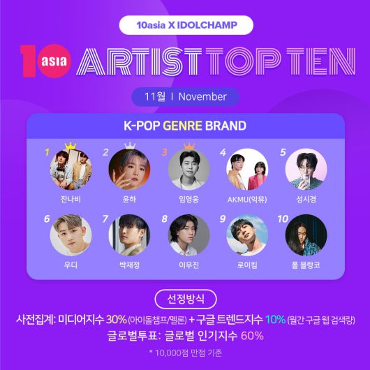 잔나비, 윤하, 임영웅, AKMU(악뮤), 성시경, 우디, 박재정, 이무진, 로이킴, 폴 블랑코가 텐아시아 아티스트탑텐(TENASIA ARTIST TOP TEN) 11월 'K팝 장르 브랜드(K-POP GENRE BRAND)' 주인공으로 선정됐다.