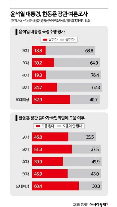 한 장관의 총선 출마 찬성 여부를 묻는 여론조사기관 공정의 여론조사(데일리안 의뢰로 지난달 29~29일, 전국 18세 이상 성인남녀 1002명 대상으로 ARS 방식으로 조사)에서도 같은 흐름이 확인된다. 한 장관의 총선 출마에 대해 20대 43.8%, 30대 51.1%, 40대 50.2%, 50대 48.0%, 60대 55.3%, 70세 이상 61.7%가 각각 찬성했다. 70대 이상을 제외하면 고른 지지 흐름이다. 반면 윤 대통령의 경우 20대 30.0%, 30대 32.9%, 40대 30.5%로 저조하다 50대 48.2%, 60대 52.3%, 70대 59.0%에서 지지율을 상승하는 추세를 보였다.