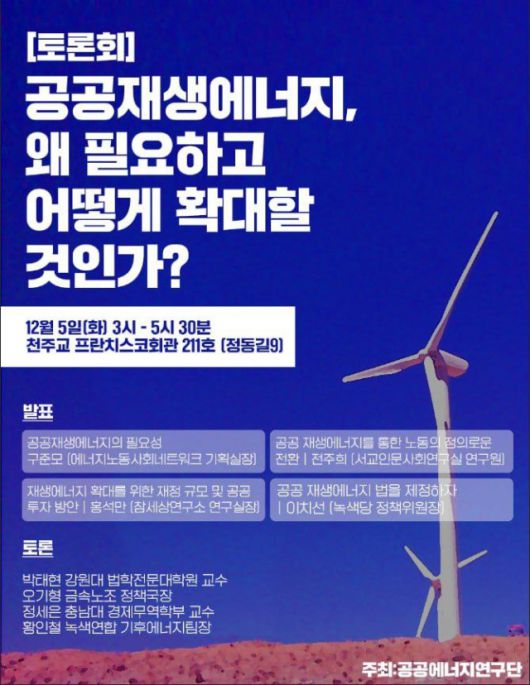 공공재생에너지의 확대가 기후위기에 대응할 수 있는 가장 빠른 길이다. 뿐만아니라 가장 정의로운 길이다. 2025년부터 본격적으로 석탄발전소 노동자들의 일자리 전환을 지원하며, 재생에너지 확대 속에서도 환경훼손을 최소화하고 지역주민의 인권을 보호하며, 기업 이윤을 제거하며 시민들의 필수 에너지 사용을 보장할 가능성을 높이는 방법이 공공재생에너지 확대다. 이번 총선에서 중요 쟁점이 되어야 할 제안이며, 또 내년 기후정의운동의 핵심적 과제가 될 것이다(보다 자세한 제안은 12월 5일의 토론회를 통해서 공개될 예정이다).