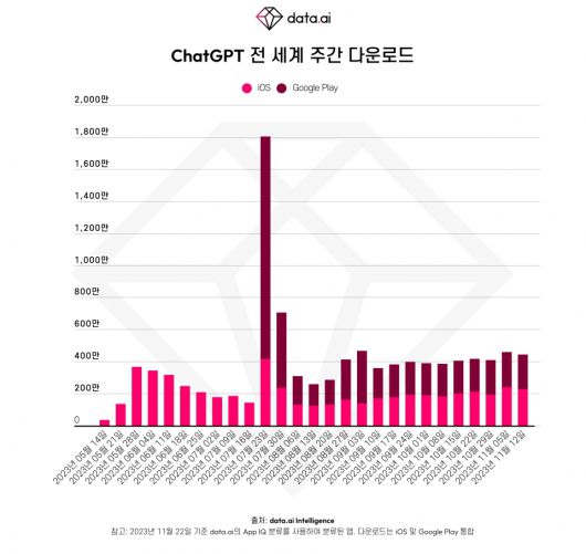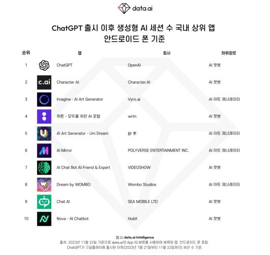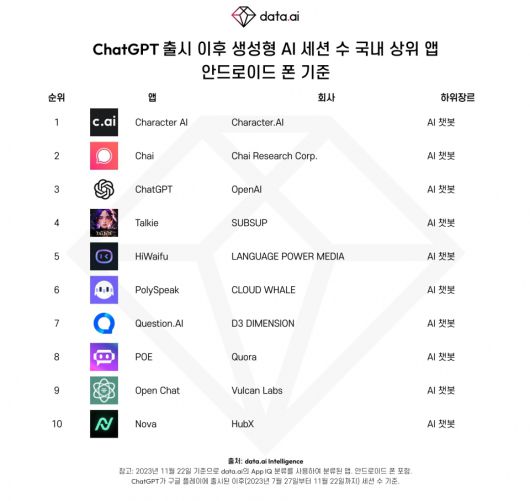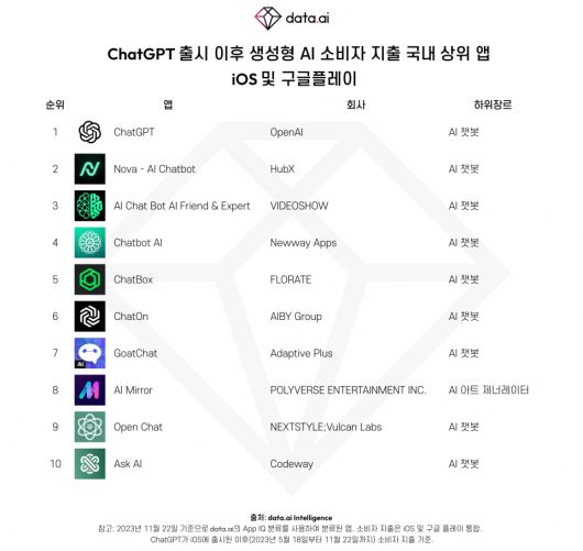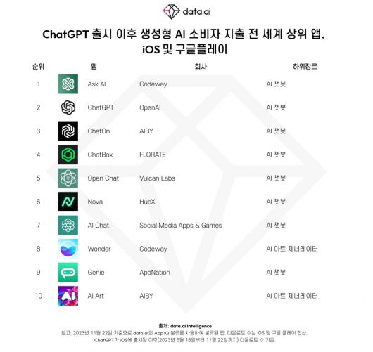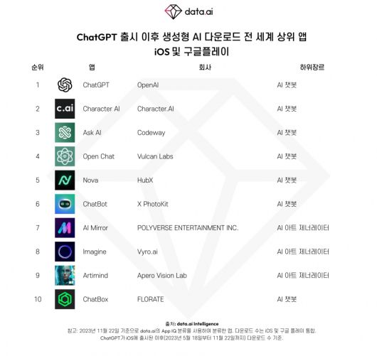 업계에서 가장 신뢰받는 데이터 및 분석 플랫폼 data.ai(데이터에이아이)가 AI 챗봇 'ChatGPT' 출시 1주년을 맞아 생성형 AI 앱 현황을 발표했다.