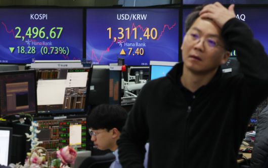 5일 오전 서울 중구 하나은행 딜링룸에서 딜러들이 업무를 보고 있다. 뉴시스 제공 |