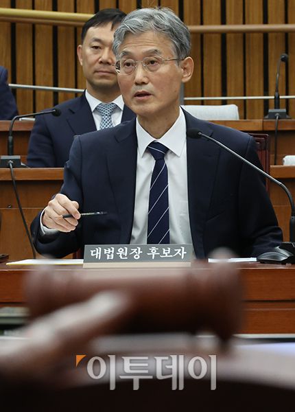 조희대 대법원장 후보자가 5일 서울 여의도 국회에서 열린 인사청문회에서 의원 질의에 답하고 있다. 고이란 기자 photoeran@ |