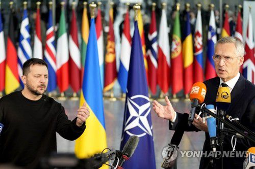 언론 브리핑하는 우크라 대통령과 나토 사무총장 |