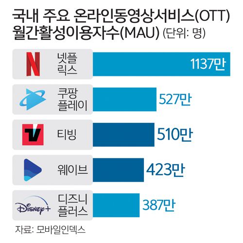 합병이 성사되면 국내 2위로 올라서 투자력과 구독자를 기반으로 좋은 콘텐츠를 확보할 수 있을 것으로 기대된다. 모바일인덱스가 집계한 지난 10월 MAU는 넷플릭스가 1137만명으로 1위, 쿠팡플레이가 527만명으로 2위다. 티빙과 웨이브는 각각 510만명, 423만명으로, 합치면 933만명이다. 중복가입자가 있다는 점을 고려해도 쿠팡플레이를 넘어선다.