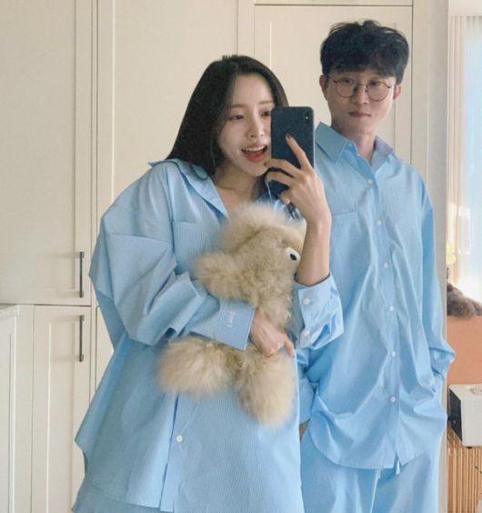 공개된 사진에는 하늘색 커플 잠옷을 입고 거울 셀카를 찍고 있는 이솔이와 박성광의 모습이 담겼다.