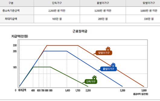 최대지급액은 단독가구 150→165만 원, 홑벌이가구 260→285만 원, 맞벌이가구 300→330만 원이다.