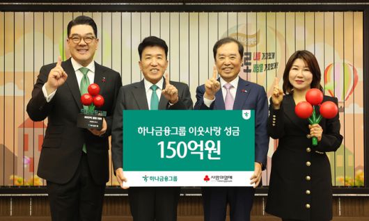 함영주 하나금융그룹 회장(왼쪽 두 번째)이 5일 서울 중구 세종대로 사회복지공동모금회 본관에서 진행된 ‘희망 2024 나눔캠페인’ 전달식에서 연말 이웃돕기 성금 150억원을 기탁한 뒤 김병준 사회복지공동모금회 회장(〃 세 번째)과 기념 촬영을 하고 있다. 하나금융그룹 제공 ⓒ 세상을 보는 눈, 세계일보
