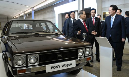 윤석열 대통령이 5일 서울 강남구 코엑스에서 열린 제60회 무역의날 기념식 참석에 앞서 행사장 옆 전시관을 찾아 이수일 전 현대차 기술연구소장에게 포니 자동차에 대한 설명을 듣고 있다. 국산 자동차 고유 모델인 포니는 1976년 에콰도르에 5대가 수출된 것을 시작으로, 1982년에는 약 60개국에 수출되며 한국 자동차산업 발전의 기폭제가 됐다. 대통령실 제공 ⓒ 세상을 보는 눈, 세계일보