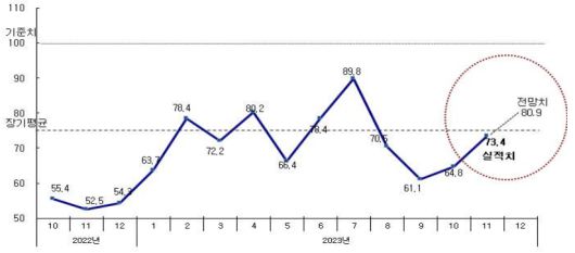 이달 CBSI 전망치는 전월 대비 7.5p 상승한 80.9로 전망됐다. 다만 수주잔고지수는 전월보다 3.6p 하락할 것으로 전망되는 등 체감경기 부진이 계속될 예정이다.