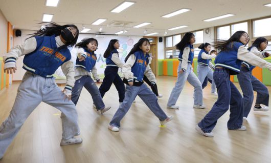 지난달 29일 경기 고양시 오금초 학생들이 방과 후 에어로빅 힙합 교실에서 노래에 맞춰 격렬한 안무를 선보이고 있다.