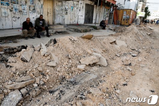 26일(현지시간) 이스라엘이 점령한 요르단강 서안지구 제닌에서 팔레스타인인들이 무너진 길가 한 켠에 앉아있다. 2023.11.27 ⓒ 로이터=뉴스1 ⓒ News1 정지윤 기자 |