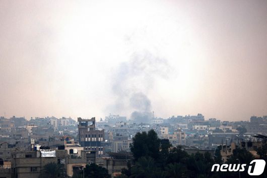 5일(현지시간) 팔레스타인 가자지구 남부 칸 유니스의 건물 위로 연기가 피어오르고 있다. 이스라엘군은 7일간의 휴전이 끝난 후 가자지구 남부에 대한 지상작전을 확대하고 있다. 2023.12.05/뉴스1 ⓒ AFP=뉴스1 ⓒ News1 김민수 기자 |