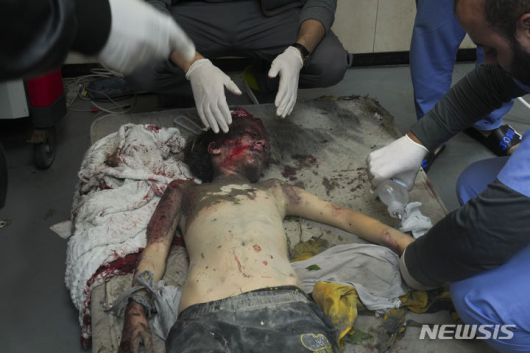 [가자지구=AP/뉴시스] 이스라엘군의 가자지구 폭격으로 부상을 당한 팔레스타인 소년이 3일(현지시각) 가자지구 데이르알발라의 병원 바닥에서 치료받는 모습. 2023.12.6 |