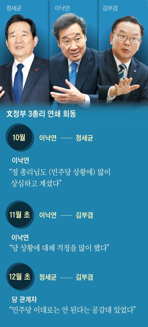 민주당 인사들은 무엇보다 세 전직 총리가 아직 한 번도 따로 한자리에서 만난 적 없다는 점에 대해 “그만큼 연대 가능성은 희박하다는 얘기”라고 했다. 하지만 상황은 언제든 변할 수 있다는 의견도 있다. 한 중진 의원은 “세 사람이 적극적 연대는 아니더라도 특정 사안에 한목소리를 내는 건 충분히 가능하다”고 말했다.