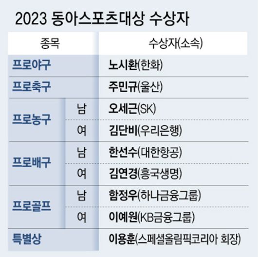프로축구에서는 이번 시즌 17골로 K리그1(1부 리그) 득점왕에 오른 주민규(33·울산)가 2021년 이후 2년 만에 수상자가 됐다. 남녀 프로골프에서는 함정우(29·하나금융그룹)와 이예원(20·KB금융그룹)이 각각 상을 받았다. 특별상은 장애인 체육 문화 활동을 지원하는 사단법인 스페셜올림픽코리아의 이용훈 회장(58)에게 돌아갔다.