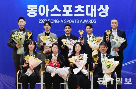 ‘2023 동아스포츠대상’ 종목별 수상자들이 5일 서울 성북구 고려대 백주년기념관에서 열린 시상식이 끝난 뒤 무대 위에 모여 기념사진을 남기고 있다. 뒷줄 왼쪽부터 시계 방향으로 오세근, 한선수, 주민규, 노시환, 이해욱 라이언앳 대표(김연경 대리 수상), 이용훈 스페셜올림픽코리아 회장, 이예원, 강예린(함정우 아내 대리 수상), 김단비. 주현희 스포츠동아 기자 teth1147@donga.com |