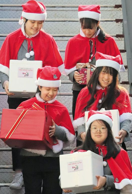 /김영근 기자 5일 오후 산타 복장을 한 광주광역시 금호중앙중 자원봉사 동아리 학생들이 김장 김치와 선물이 든 상자를 들고 인근 경로당을 향하고 있다.- Copyrights ⓒ 조선일보 & chosun.com, 무단 전재 및 재배포 금지 -
