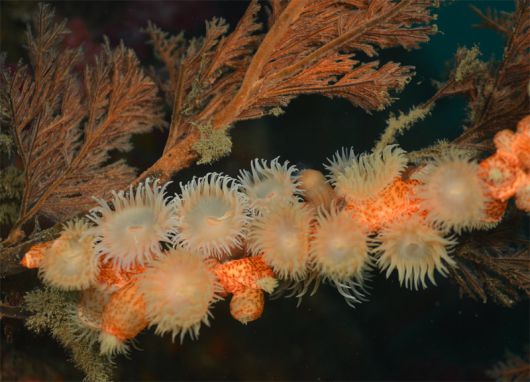 제주 연안의 해송이나 절벽에 붙어서 사는 담홍말미잘. |