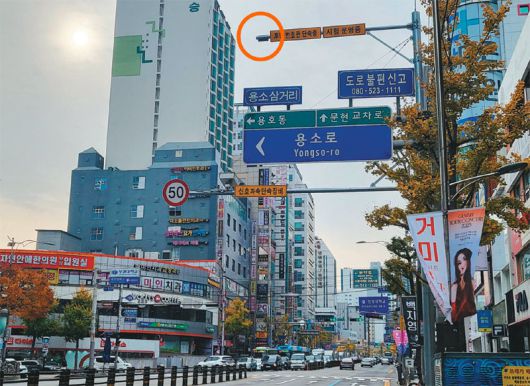 교통 혼잡이 심한 부산 남구 용호동 용소 삼거리에 설치된 차량 후면 무인 단속 카메라(원 안). 부산자치경찰위원회 제공 |
