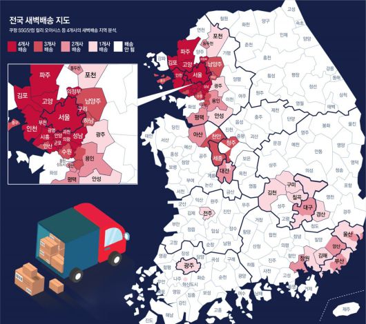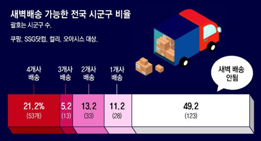 동아일보가 5일 쿠팡, SSG닷컴(이마트), 컬리, 오아시스 등 4개사의 새벽배송 가능 지역을 전수 분석한 결과에 따르면 행정지역 기준 250개 시군구 중 4개사가 모두 서비스하는 지역은 53곳이었다. 3개사가 되는 지역은 13곳(5.2%), 2개사가 되는 지역은 33곳(13.2%)이었다. 1개사의 새벽배송만 가능한 곳은 28곳(11.2%)이었다.