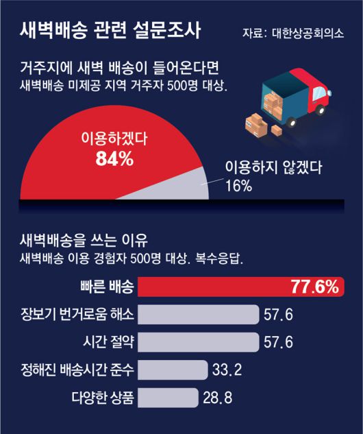 실제로 대한상공회의소 설문 결과에 따르면 새벽배송 불가 지역 소비자 84%가 ‘새벽배송을 제공하면 이용할 것’이라고 답했다. 응답자들은 그 이유로 △장보기 편리하다(44.3%) △긴급 시 유용하다(34.0%) △선택의 폭이 넓어진다(15.0%) △대도시처럼 높은 생활 수준을 누릴 수 있다(6.7%) 등을 꼽았다.