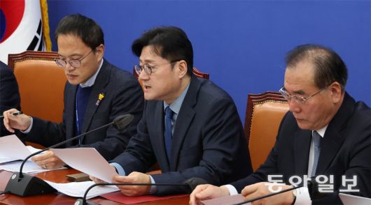 더불어민주당 홍익표 원내대표(가운데)가 5일 서울 여의도 국회에서 열린 원내대책회의에 참석해 발언하고 있다. 홍 원내대표는 CBS라디오에서 연동형 비례대표제 대신 병립형 비례대표제로 돌아갈 수 있는지를 두고 “민주당 의원들에게 내가 ‘모든 약속을 다 지켜야 하느냐’는 우스갯소리를 한 적이 있다”고 답했다. 김재명 기자 base@donga.com |