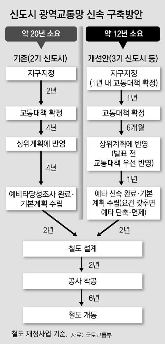 앞으로는 ‘신도시 교통난’을 막기 위해 신도시의 광역 교통망 개통까지 걸리는 시간을 철도는 최대 8년 6개월, 도로는 3년 앞당기는 방안이 추진된다. 계획 수립이나 타당성조사 절차 등을 간소화해 2기 신도시 기준 20년씩 걸렸던 광역교통망 사업 기간을 줄이는 게 골자다. 앞으로 3기 신도시 이후의 신도시는 기존 1·2기 신도시와 달리 ‘선(先)교통, 후(後)입주’를 하겠다는 취지다.