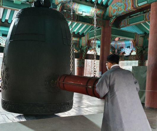 2020년 서울 종로구 보신각에서 열린 3·1절 기념타종에서 5대 종지기 신철민 씨가 타종하고 있다. 신철민 씨 제공 |