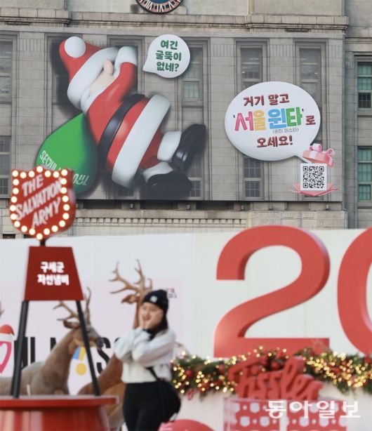 5일 오후 서울 중구 서울도서관 외벽에 산타클로스 그림과 함께 ‘서울윈타(서울윈터페스타) 2023’을 알리는 문구가 쓰여 있다. 겨울철 산발적으로 열리던 연말연시 축제와 행사를 한데 모은 서울윈타 2023은 ‘세상에 없던 빛, 서울을 물들인다’를 주제로 15일부터 내년 1월 21일까지 도심 곳곳에서 열린다.