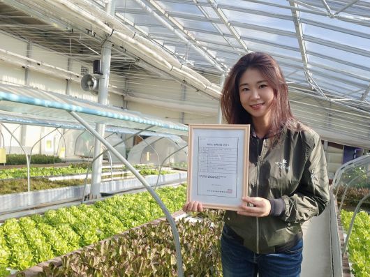 서유채농장의 홍민정 대표가 국내 아쿠포닉스 농가 최초로 받은 저탄소농산물 인증서를 들어 보이고 있다. 그는 “아쿠아포닉스 농법으로 생산한 채소는 친환경 농산물을찾는 요즘 추세와 맞는다”라고 말했다. 서유채농장 제공 |