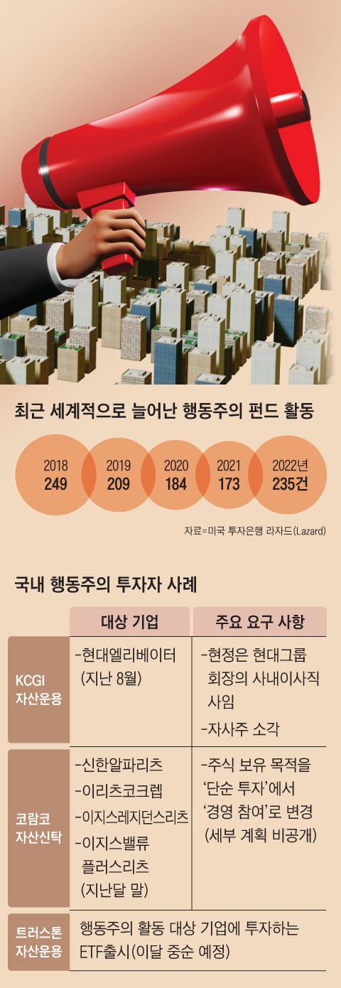 행동주의 펀드인 엘리엇인베스트는 지난달 29일 에너지기업 필립스66의 지분 10억달러어치를 인수한 후 이사회 자리 2개를 요구했다. 이 같은 소식이 보도되자 주가가 하루 새 4% 넘게 올랐다. 클라우드 기반의 소프트업체 트윌리오도 행동주의 투자자 앤슨펀드가 지분을 확보하고 있다는 소식이 알려진 지난달 28일 3% 넘게 주가가 뛰었다. 미국 투자은행 라자드에 따르면 지난해 글로벌 행동주의 펀드의 활동(캠페인)은 235건으로 전년 대비 36% 증가했다. 금리 인상 등으로 기업들의 구조적 문제가 부각되자 행동주의 펀드가 이를 기회 삼아 활동을 늘리게 됐다는 분석이 나온다.